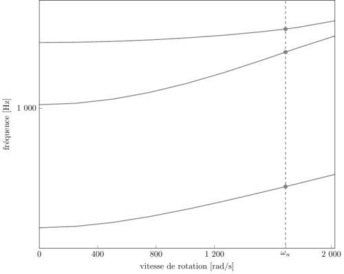 Évolution des fréquences propres des 3 premiers modes, en fonction de la vitesse de rotation, pour le maillage obtenu avec OpenMCAD[2]: