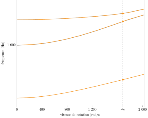 diagramme de Campbell calculé avec une précharge centrifuge linéaire, noeuds du pied d'aube encastrés (vitesse nominale ωₙ = 1 686 rad/s)