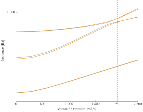 Évolution des fréquences propres des 3 premiers modes, en fonction de la vitesse de rotation, pour le maillage obtenu avec OpenMCAD[2]: