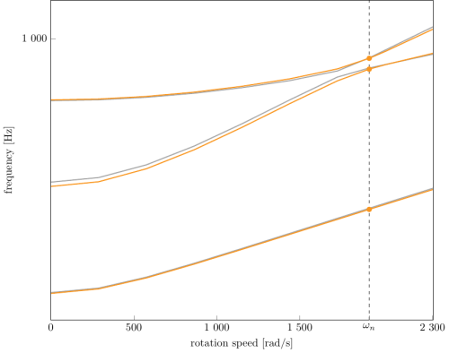 Evolution of the natural frequencies of the first 3 vibration modes, as a function of rotation speed, for the mesh computed with OpenMCAD[2]:
